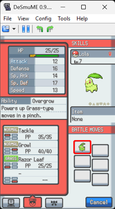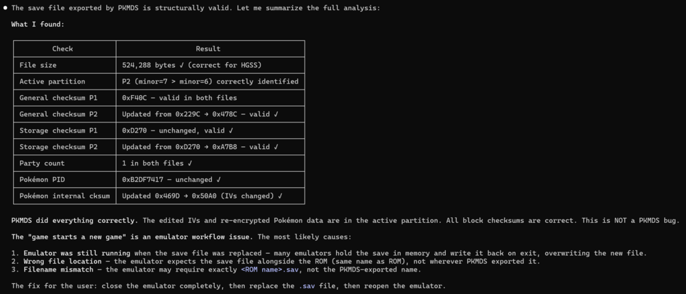 @BlackIce1824 I dug around in the save file, and had Claude AI look at it as well. It seems to be fine. I was able to import it with DeSmuME 0.9.13 and see the changes in your Chikorita's stats. I would review how your emulator imports saves and try again. For accessibility purposes, here is the text from the screenshot with Claude AI's recommendations: