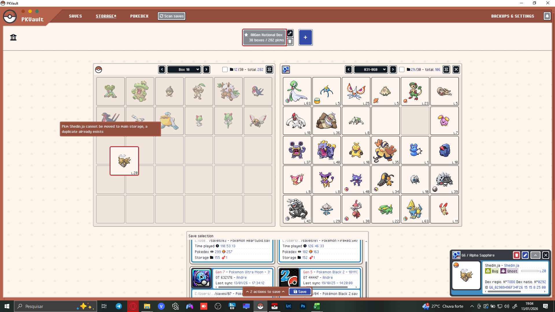 I'm having an issue, the app is preventing me to move my Shedinja from Alpha Sapphire to the box because it shares the same ID with Ninjask, what i have to do? The only solution i've found was to catch another Nincada in-game and evolve it to transfer the new Shedinja into the box - Today