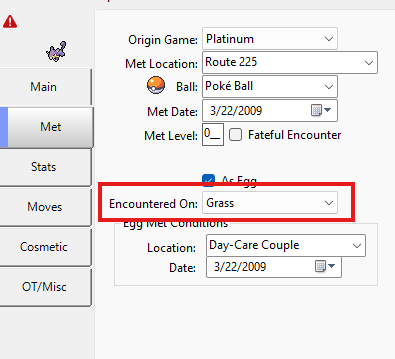 @theSLAYER im batch editing mons on platinum, specifically i want them to make look like theyre hatched from eggs. the strings i used are: .Version=Pt .Ball=4 .MetMonth=3 .MetDay=22 .MetYear=9 .MetLevel=0 .IsEgg=False .EggLocation=2000 .EggMonth=3 .EggDay=22 .EggYear=9 but i dont know what string should i choose for "encountered on" field. when i manually change it as "None" to 1 mon, it became legal, but i dont know what string should i use for batch, i already searched for solutions on google, gemini and chatgpt, but i cant find the right answer, i also looked to the past comments on this thread but didnt find information about it. hope you can help me, thank you very much.