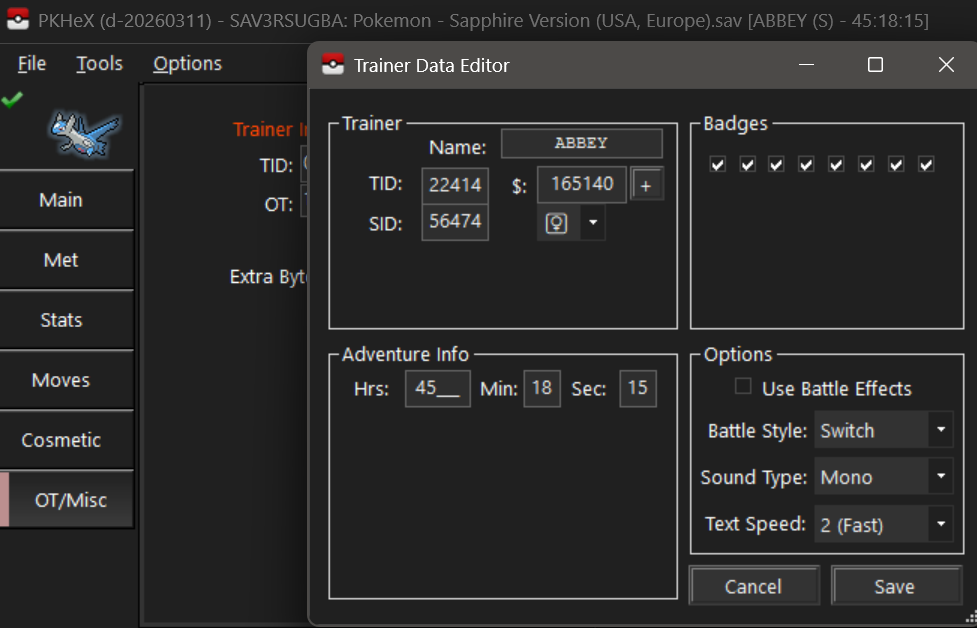 4. I went to save my game and somehow it froze during the process. I let it sit for a few minutes, but I eventually had to bite the bullet and shut it off. Upon reboot, the game says "The save file has been deleted..." I backed up my save on a GB Operator and tried looking through the file on PkHex to see if it can be salvaged, and I even saw a previous post around here that pointed me in a possible direction. In the Trainer Editor, the OT, TID, SID, and playtime are all blanked out. However, when I tried plugging those back in, I couldn't save a new trainer name. If you wanna take a shot at re-adding those, the OT is ABBEY, the TID is 22414, SID is 56474, and my time was at approximately 41 hours. Any advice is appreciated. Thank you! (Also don't mind the event gift Pokemon; I have a flash cart and was using Aura Mews as synchronizers in my Emerald save) Pokemon - Sapphire Version (USA, Europe).sav