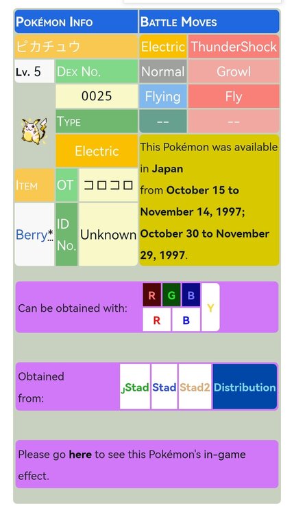 I was looking for it for weeks carving information but I gave up when I didn't find anything related to its method of obtaining outside of that event in Japan in addition to the fact that the searches had nothing related to yellow pokémon.
